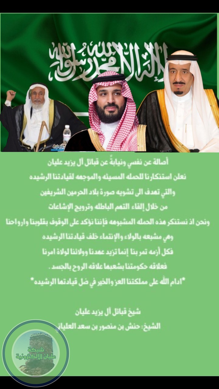 نيابةً عن قبائل الٓ يزيد عليان الشيخ حنش بن منصور العلياني يجدد الولاء والسمع والطاعة لحكومتنا الرشيدة ويعلن استنكاره للحملة المسيئة والموجهة لحكومتنا الرشيدة